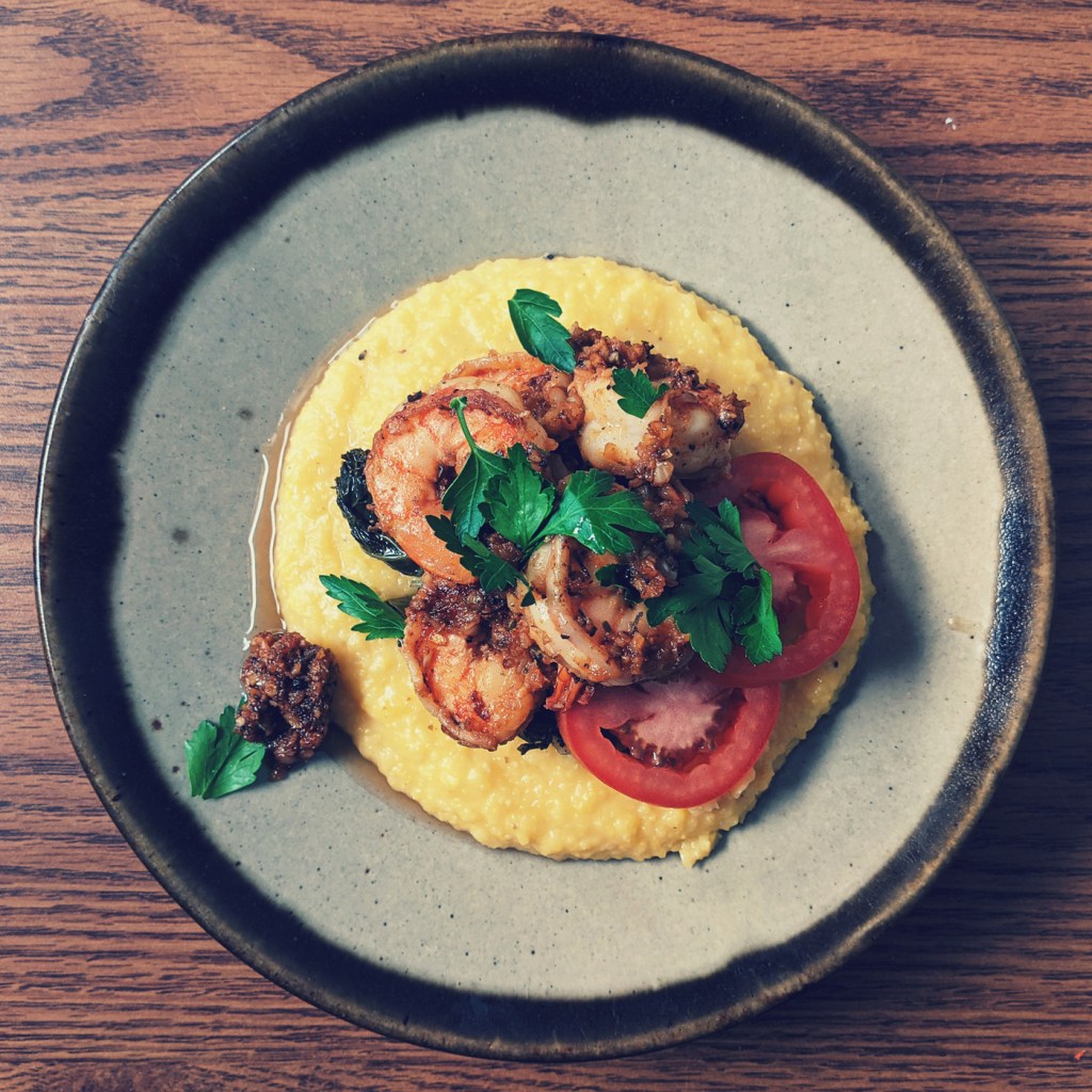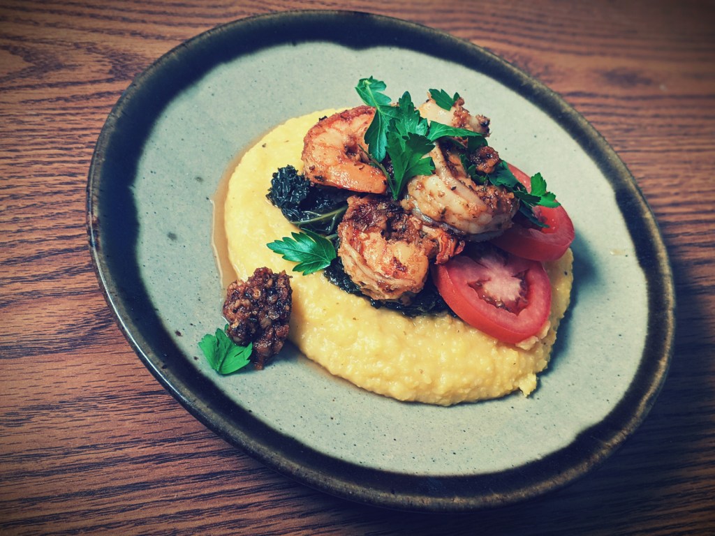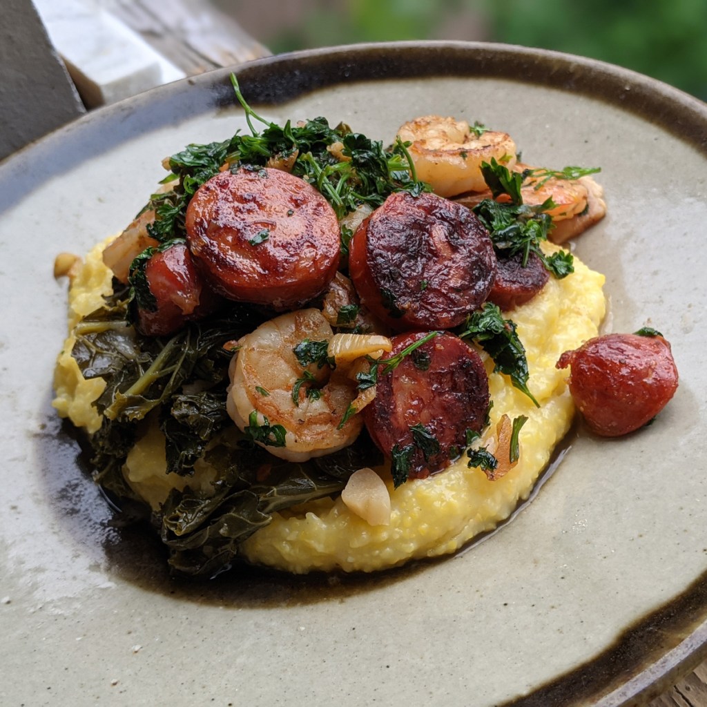 Shrimp & Grits by special request! Went to a grocery store I’d never been to for the grits and was surprised by their inventory. Definitely will be back. Also piled on collard (kale) greens to round it out.