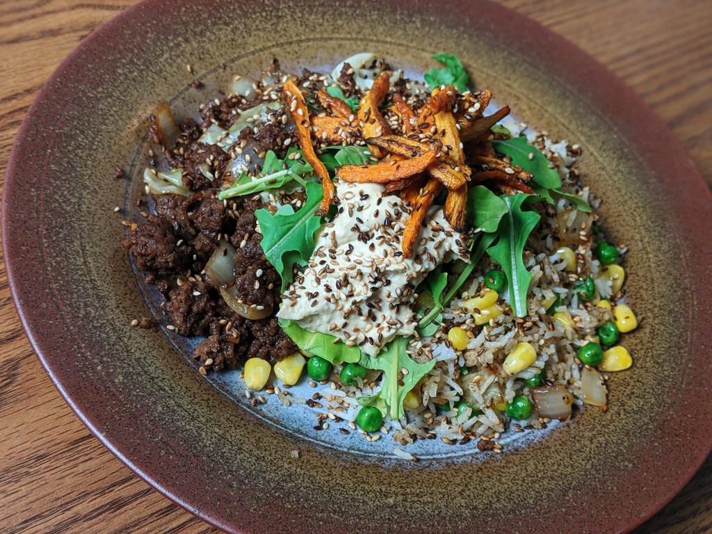 So noisy my eyes hurt… but still satisfying. Korean beef, fried rice, hummus, air fried yam.
