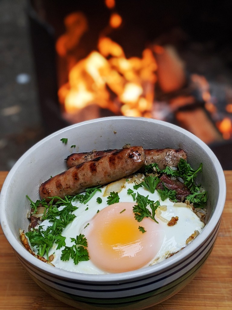 Someone wanted sausage and eggs for breakfast… leftover Kalbi and rice means fried rice… why not throw in some Greek style seasoning mix. Very satisfied munching by the fire.