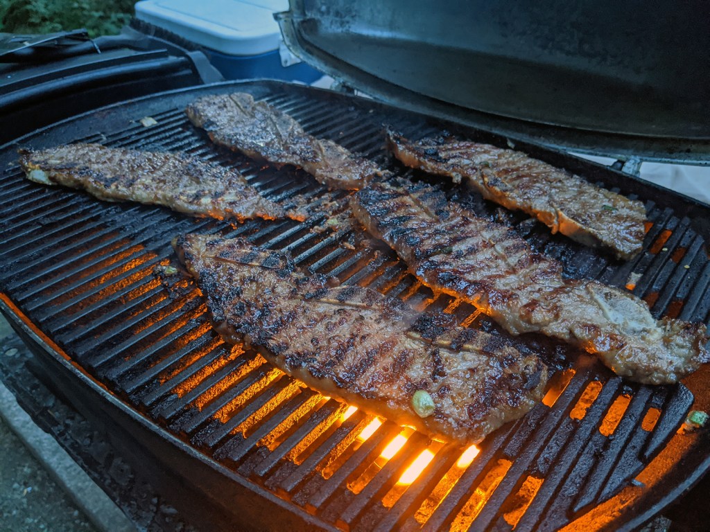 Finally got some camping (*cough*glamping*cough*) in! Deliciously marbled Kalbi, and beer BBQ drumsticks.