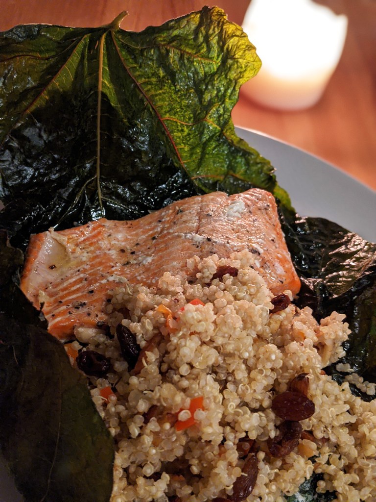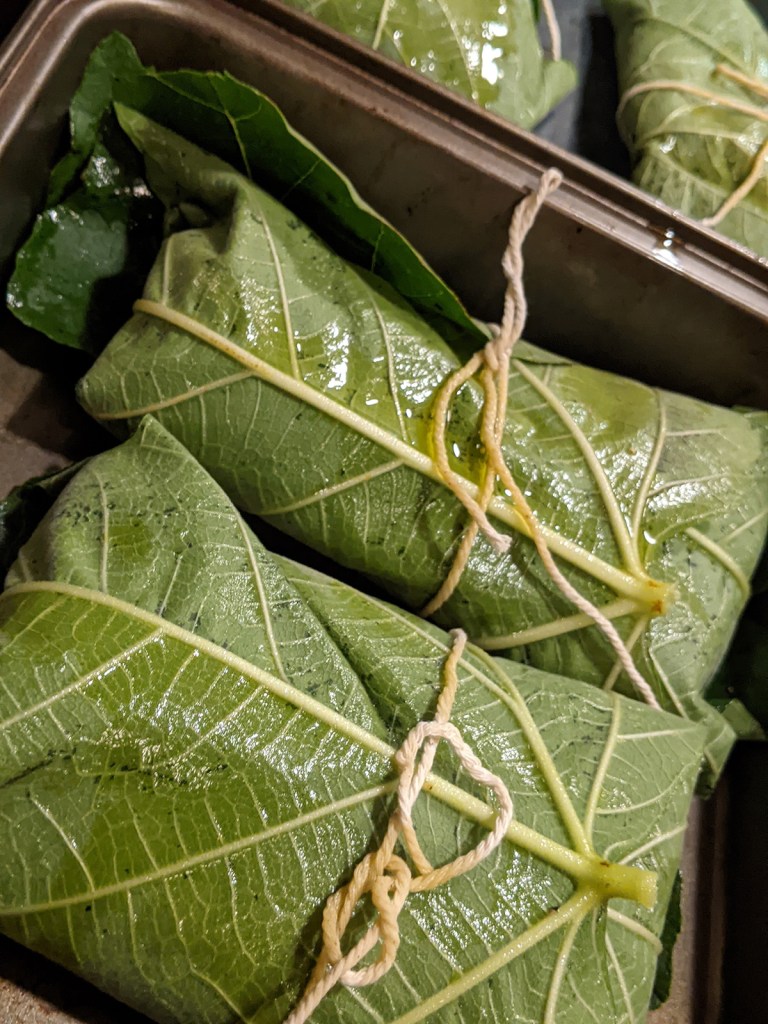 So I heard several times on Home Cooking (the most charming food podcast evar) about using fig leaves. Never knew you could use them, and I have a beautiful one right outside!