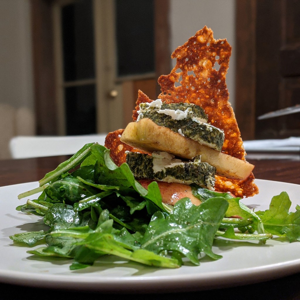 Of course, entry 42 must involve cheese! Four cheese crisp, goat cheese, apples and arugula with balsamic dressing. Plus, super secret guest photographer!