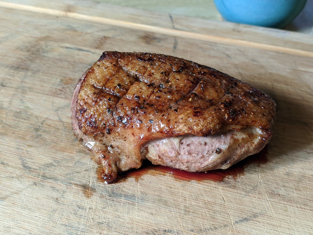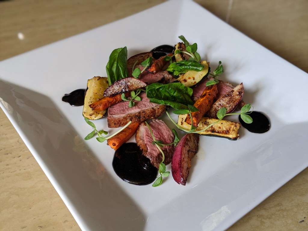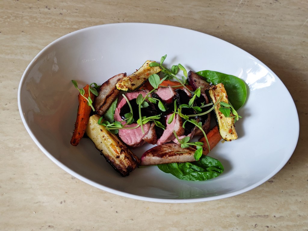 Mmm been thinking about doing a pan fried duck breast for a while. Here with roasted veg, seared nectarine, pea shoots, and red wine and balsamic reduction.