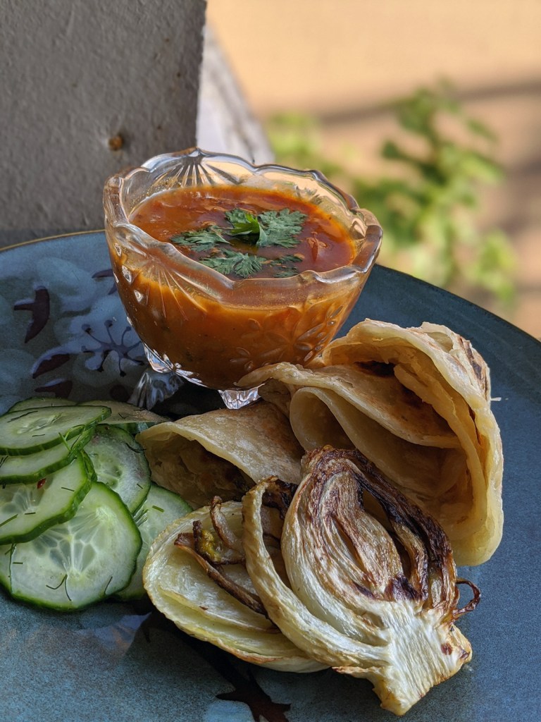 Packaged dinner night! Frozen parotta with sambar mix, ghee fried fennel and sweet & sour cucumber salad.