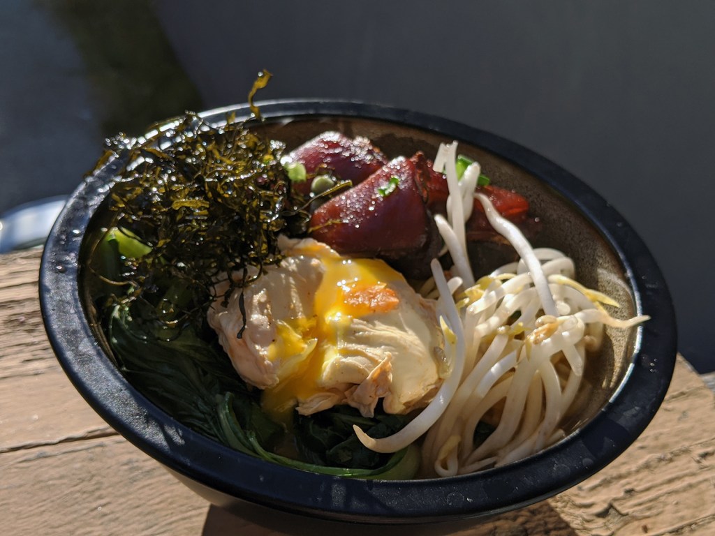 Moar suped up instant ramen! This time mixed the tonkotsu broth with kimchi broth. Topped with a poached egg and crispy air fried shredded kelp.