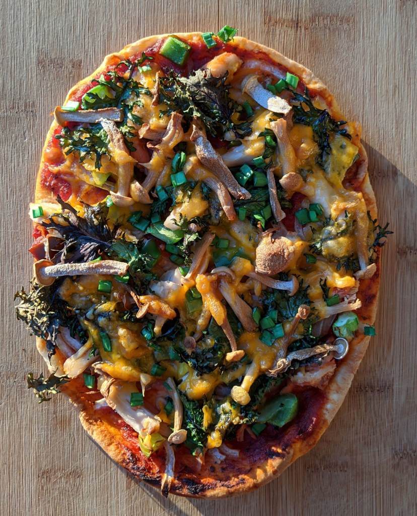 Naan pizza with garden kale, enoki, and leftover rotisserie chicken of course.