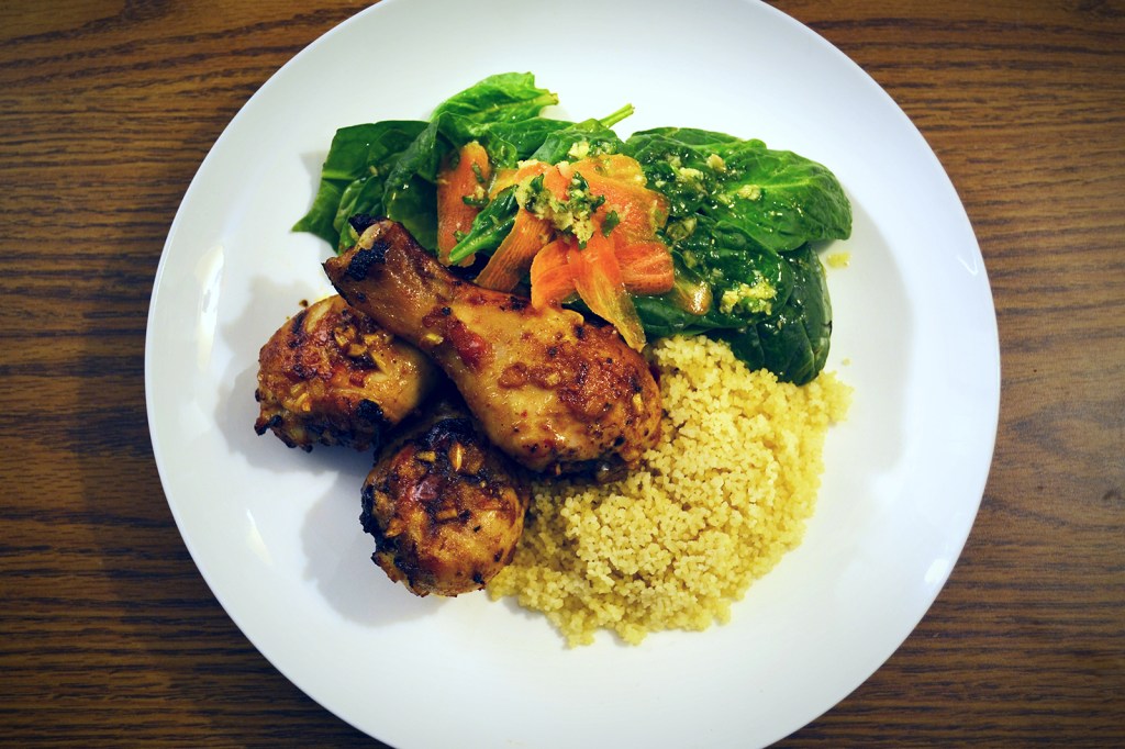 So getting back into the random a little bit. Grabbed everything umami/tangy in the pantry: Tom Yum, Kimchi, Worcestershire, Miso, some kind of Asian pepper paste, leftover tomato sauce, and sambar powder into a marinade for the chicken legs. Couscous and spinach salad with a ginger sesame dressing.